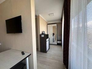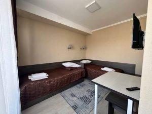 Номер с новой мебелью, мягким половым покрытием (ковролин), с мини-прихожей . В номере 2 односпальные кровати, тумбочки, стол со стулом, кресло, шкаф, холодильник, TV, вешалка и отдельный санузел.