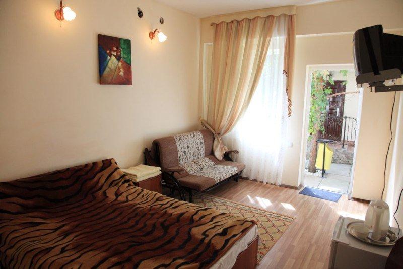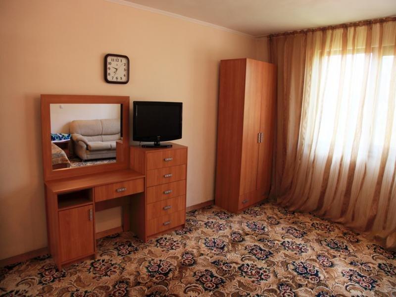 2-х комнатный. В номере: 2-х спальная кровать, раскладной диван, сан узел, душ, спутниковое ТВ, холод-к.