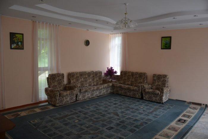 Зал: большая комната, мебельный гарнитур, стол, стулья, диван, кресла, ковер. Спальная: двухспальная кровать, прикроватные тумбочки, шкаф. Все номера с балконом, выход на балкон с обеих комнат, туалет и ванная с умывальником отдельно, горячая и холодная вода круглосуточно, вешалка, ТВ, холодильник, стены под яйцо, хорошее освещение, занавеска, балкон выходит на озеро (юг) - есть место для дополнительной кровати.