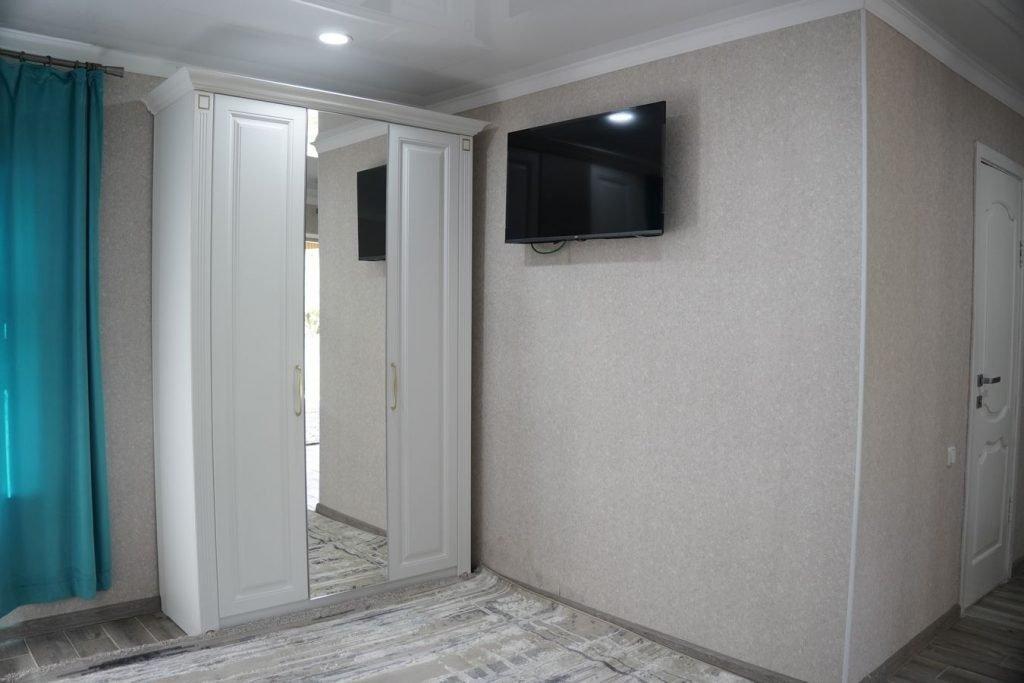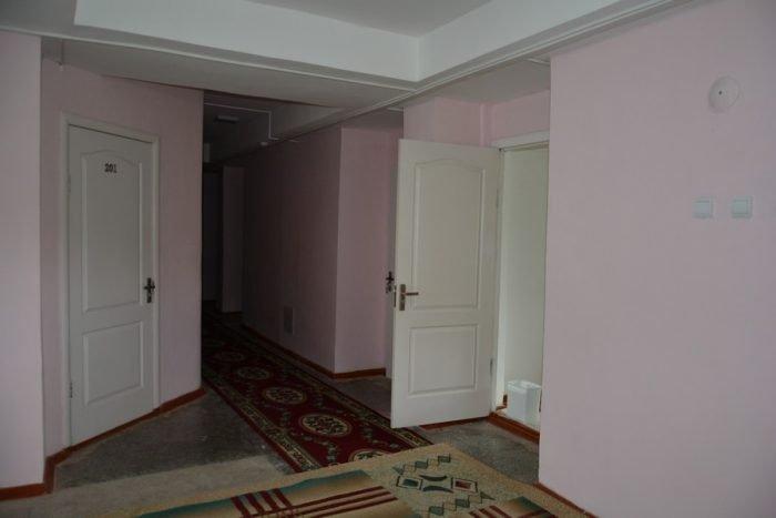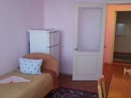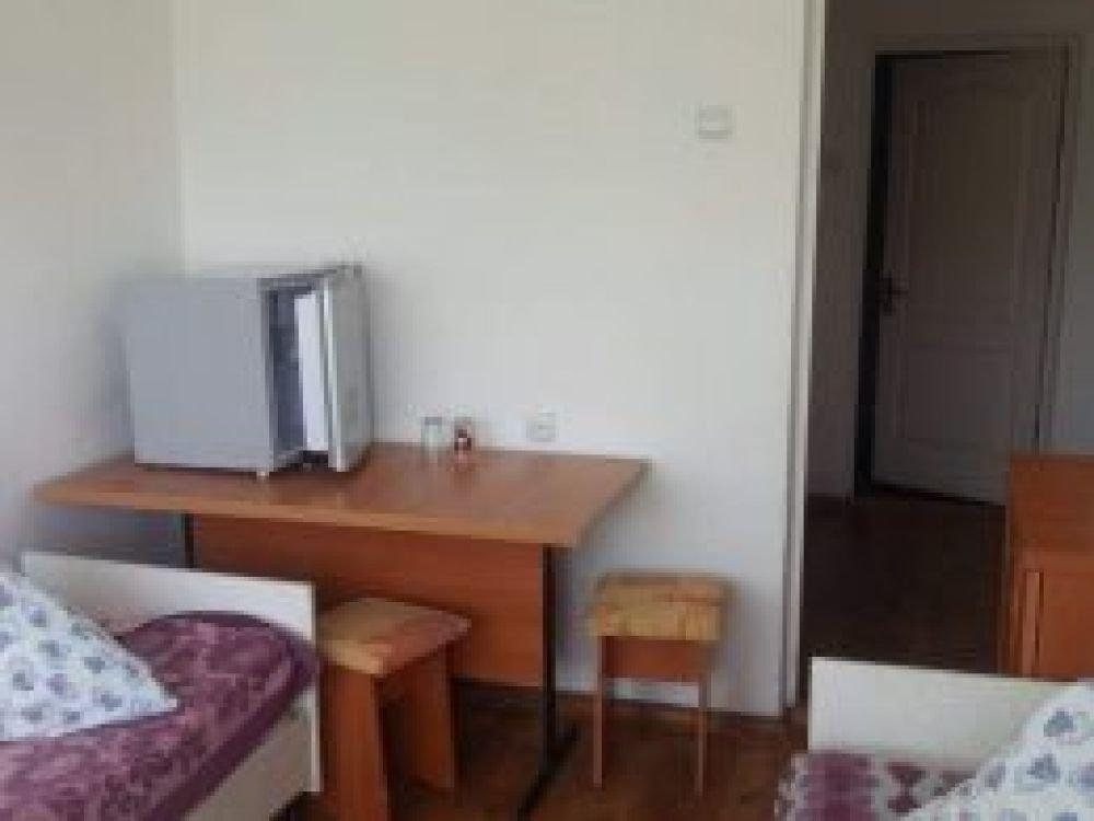 Две комнаты, коридор, 5-ть кроватей односпалок, две в одной комнате, три в другой, прикроватные тумбочки, все номера с балконом, выход на балкон с обеих коинат, туалет и ванная с умывальником отдельно, горячая и холодная вода круглосуточно, вешалка, ТВ, холодильник, стол, табуретки, коврик, стены побелены, занавеска, балкон выходит на озеро (юг).