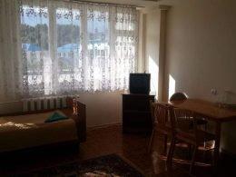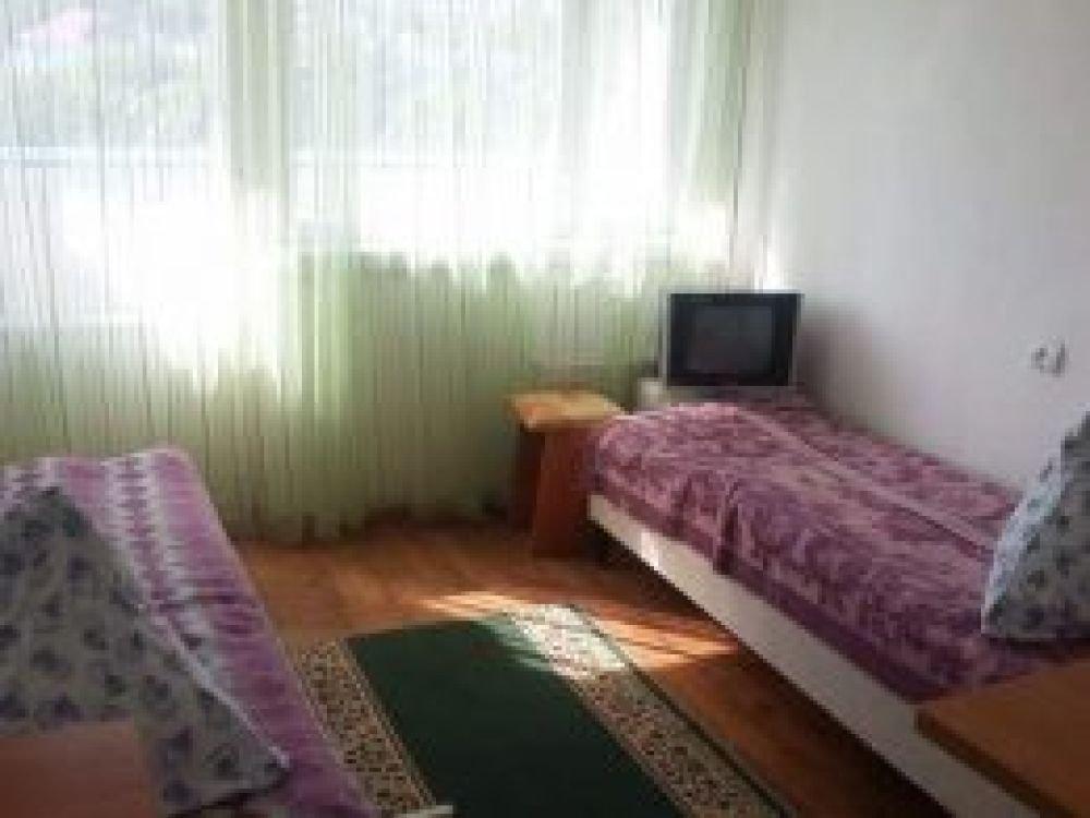 Одна комната, 2-е кровати односпалки, прикроватные тумбочки, балкон, туалет, душ и умывальник с горячей и холодной водой круглосуточно, вешалка, ТВ, холодильник, стол, табуретки, коврик, стены побелены, занавеска, балкон выходит на горы (север).