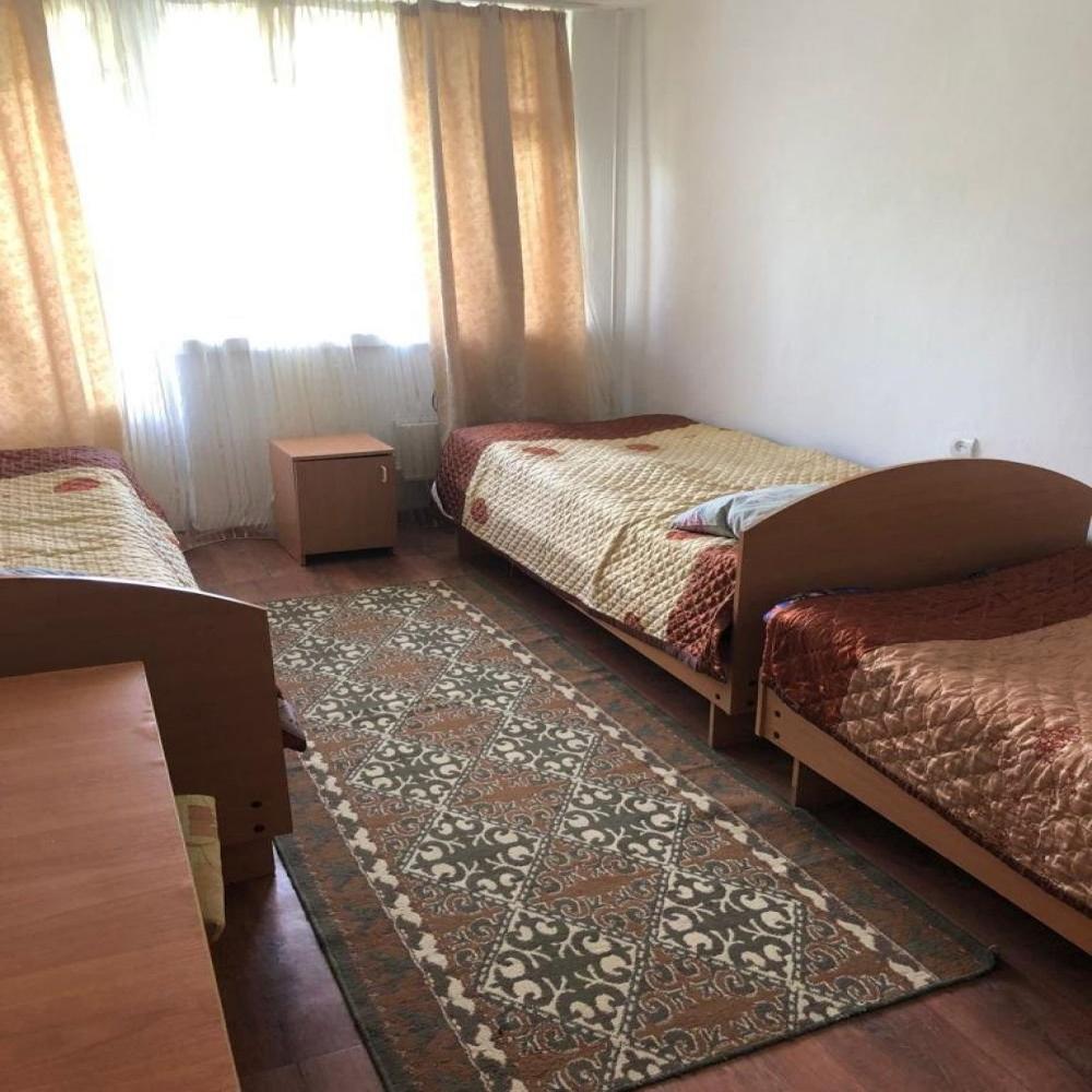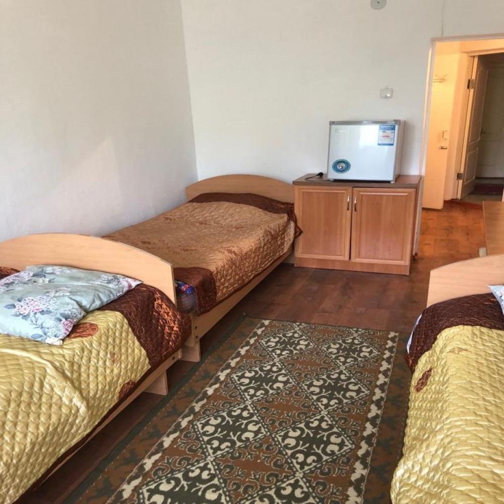 Одна комната, 3-и кровати односпалки, прикроватные тумбочки, почти все номера с балконом, туалет, душ и умывальник с горячей и холодной водой круглосуточно, вешалка, ТВ, холодильник, стол, табуретки, коврик, стены побелены, занавеска, балкон выходит на озеро (юг).