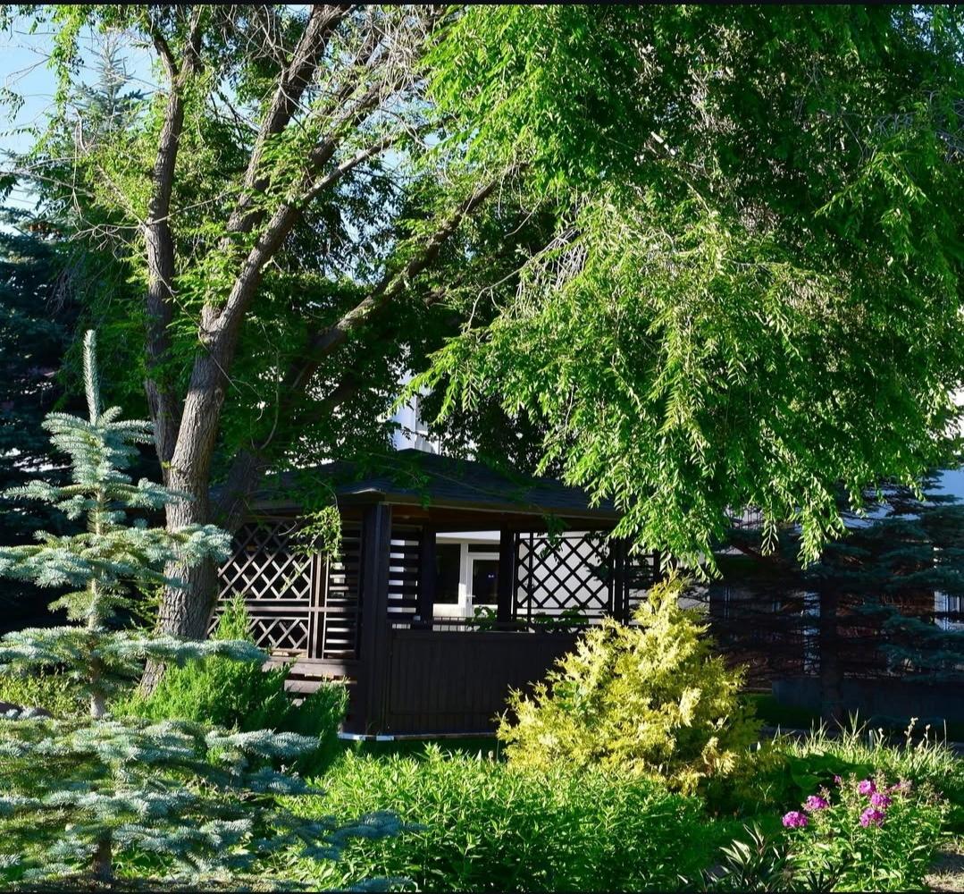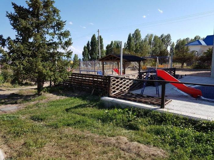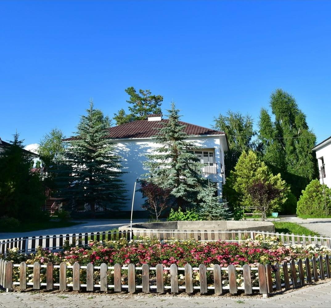 Территория небольшая, но очень чистая и ухоженная. Территория озеленена цветами, газоном и различными кустами, также растут большие ели. На территории имеется большой и маленький бассейн, теннисный корт, бильярдная, конференц-зал и столовая. Возле ворот есть охраняемая стоянка