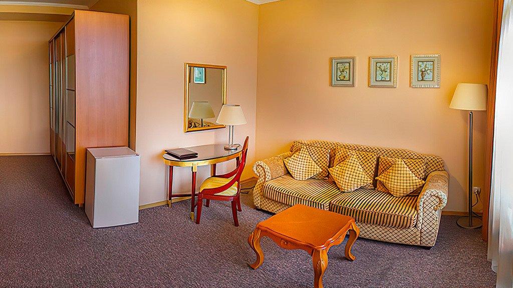 Люкс двухместный располагается в четырехэтажном корпусе на 1,2,3 этаже, представляет собой комфортный 2-х комнатный номер, состоящий из спальной комнаты с двуспальной кроватью, телевизор и комфортной гостиной с мягкой мебелью, журнальным столиком, телевизором, сан. узлом (душ-кабина), с двумя балконами с ротанговой мебелью (столик, кресло) с видом на озеро или на горы. Кровать рассчитана на два человека. При дополнительном заселении взрослого или ребенка старше 5 лет предоставляется раскладушка.