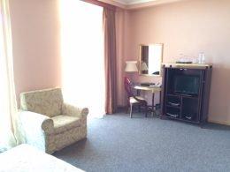Стандартный одноместный номер располагается в четырёхэтажном корпусе, представляет собой комфортный однокомнатный номер площадью 19 кв.м с большой двуспальной кроватью, сан. узлом (душ-кабина), балконом с видом на озеро или на горы. В номерах на 4-м этаже балконов нет