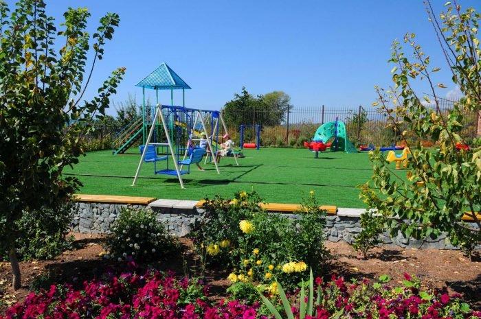 В первую очередь, «Меридиан» ориентирован на спокойный семейный отдых, здесь не проводится шумных дискотек, нет оживленной ночной жизни. К организации детского досуга пансионат подошел с особым вниманием: в стоимость проживания включено пользование игровой площадкой с атравматическим покрытием, детским батутом, анимационная программа и театрализованные представления. Проводятся занятия с педагогом в детской комнате. Территорию украшают небольшие цветные скульптуры животных, даже валуны на газонах раскрашены в яркие цвета.