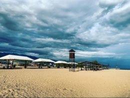 • Пляж с зонтами и шезлонгами