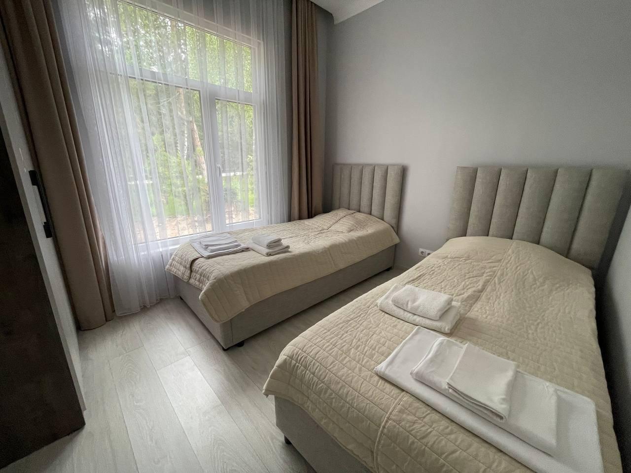 3-х местный 2х- комнатный. В гостиной мягкая мебель - диван, бойлер в каждом номере. Хороший ремонт, телевизор, холодильник, душ, туалет, кровати.