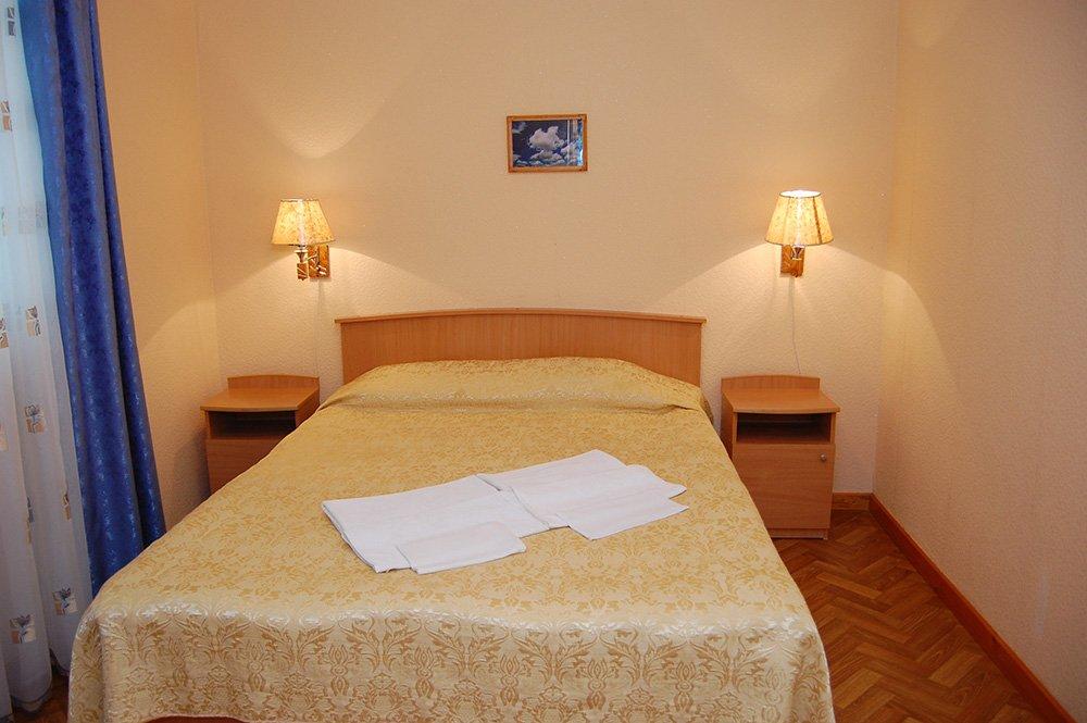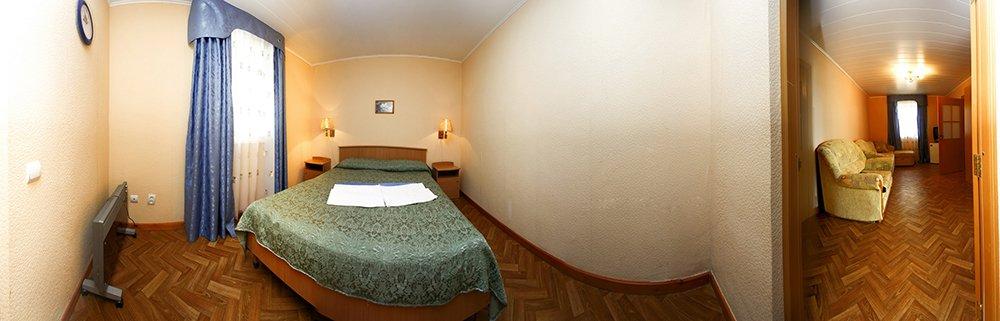2-х комнатный: 2+2 или 4-х местный 2 спальни: в одной 2-спальная, в другой 2 полуторные кровати, сан узел, душ.кабина, ТВ, спутниковое ТВ, холод-к, веранда.