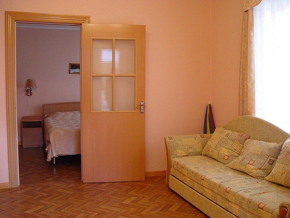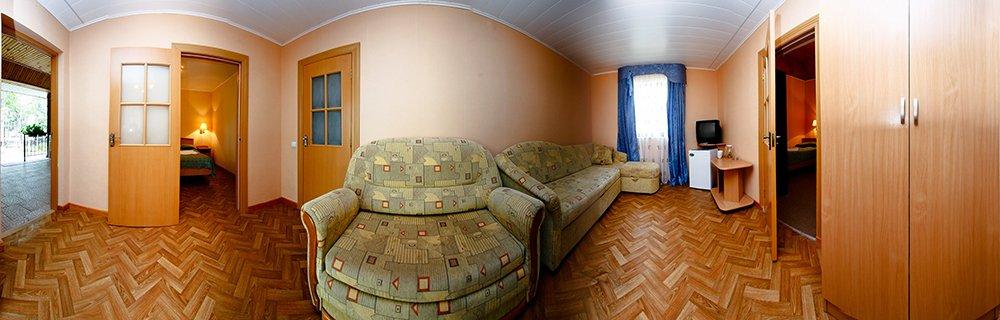 3-х комнатный: 4+2 или 6-ти местный 2 спальни: в одной 2-спальная, в другой 4 полуторные кровати, гостиная с мягкой мебелью, сан узел, душ.кабина, ТВ, спутниковое ТВ, холод-к, веранда.