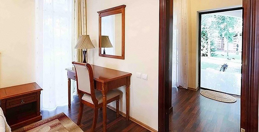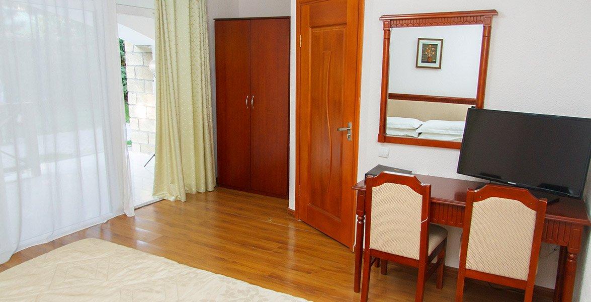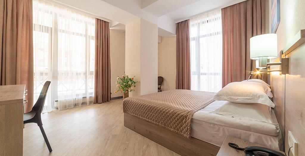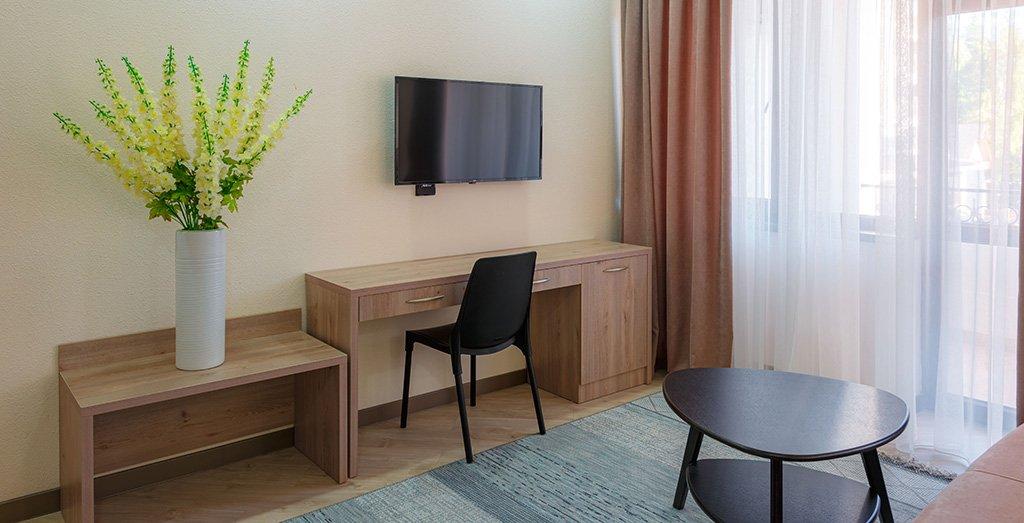 Номера отеля отвечают международным стандартам и оформлены в едином классическом стиле. Преобладающая часть номеров имеет персональный балкон или террасу с плетеной мебелью.